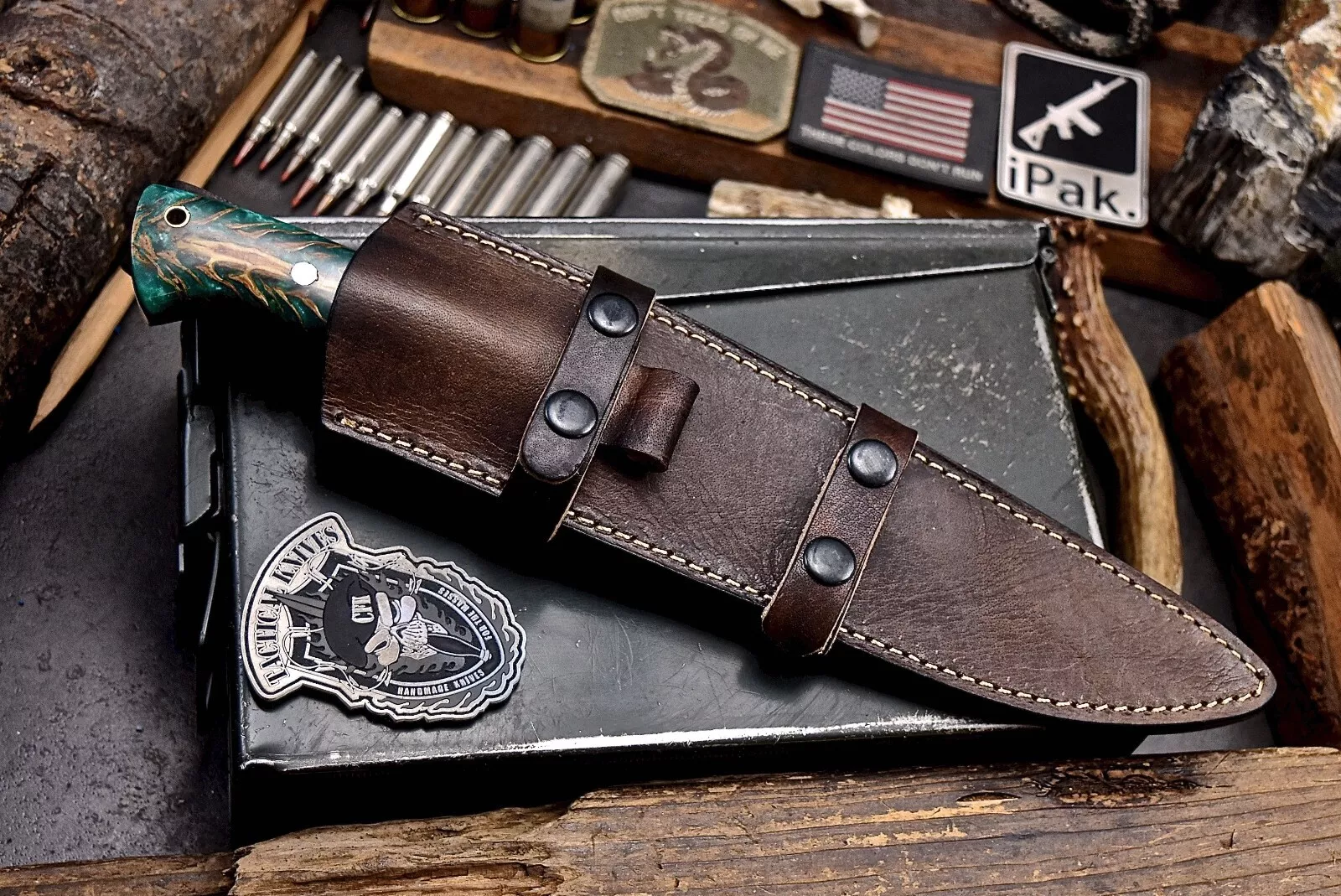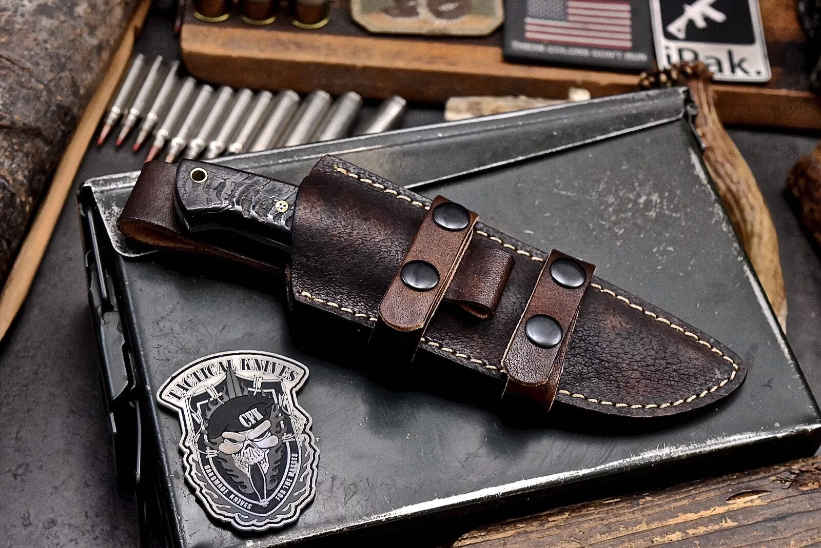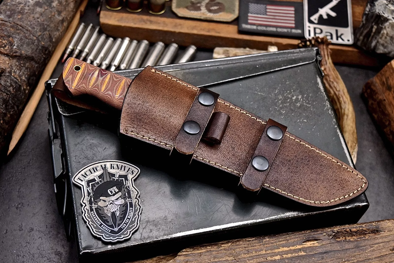 D2 Tool Steel is a high-carbon, high-chromium, air-hardening tool steel that is characterized by a relatively high attainable hardness and numerous, large, chromium-rich alloy carbides in the steel. D2 provides an effective combination of wear resistance and toughness. D2 holds an edge very well. When needed, use a Diamond Wet Stone or better to re-sharpen the blade at 20-degrees. When done using the knife, wash it is soap and water, dry completely, coat in gun oil and store away from the sheath. Leather pulls moisture out of the air and can rust the blade if stored improperly.
