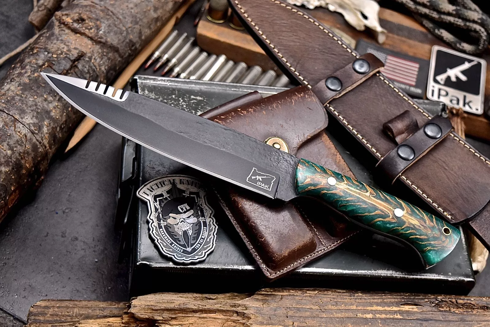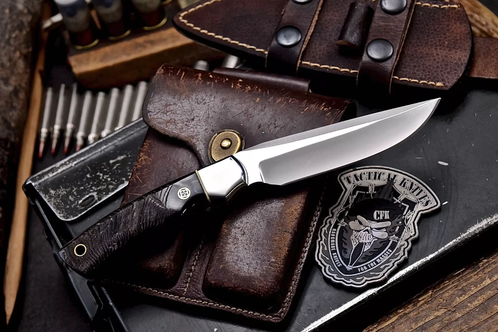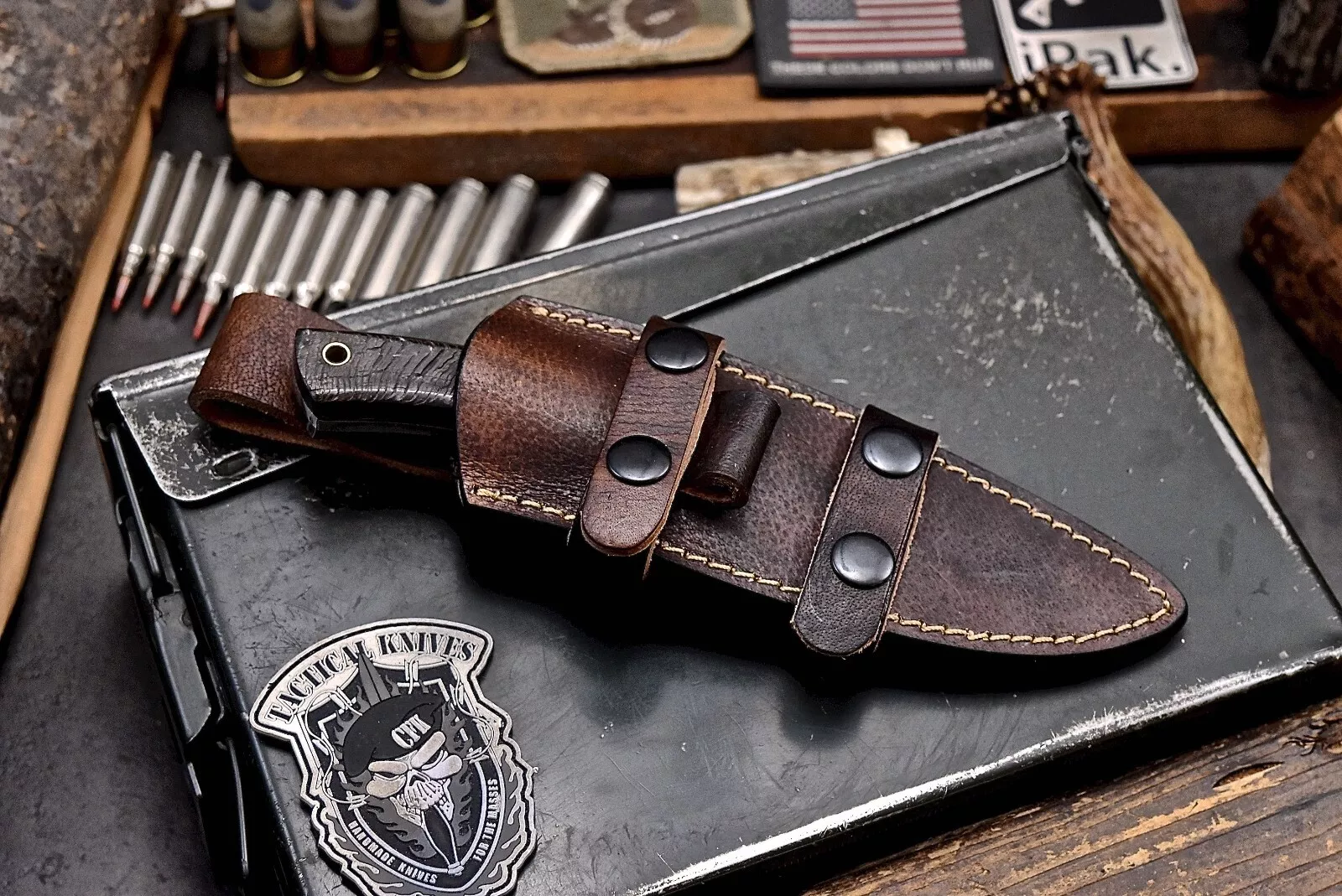D2 Tool Steel is a high-carbon, high-chromium, air-hardening tool steel that is characterized by a relatively high attainable hardness and numerous, large, chromium-rich alloy carbides in the steel. D2 provides an effective combination of wear resistance and toughness. D2 holds an edge very well. When needed, use a Diamond Wet Stone or better to re-sharpen the blade at 20-degrees. When done using the knife, wash it is soap and water, dry completely, coat in gun oil and store away from the sheath. Leather pulls moisture out of the air and can rust the blade if stored improperly.